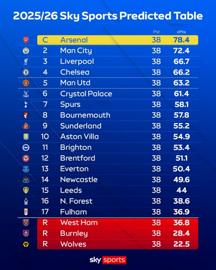 太空体育展望本赛季英超最终排行(积分为模拟10万次的平均值)