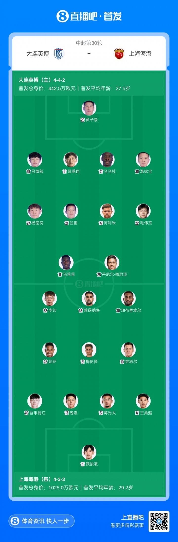 11月22日讯 中超第30轮收官战当天下昼15:30进行,大连英博主场迎战上海海港,赛前两边公布首发威望。海港本场比赛不败即可锁定中超冠军,主裁判是韩国评判员金希坤。