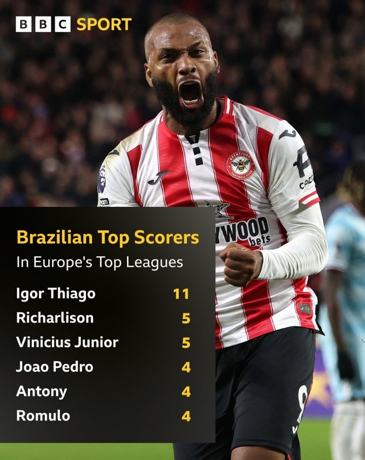 11月30日讯 在本轮英超,布伦特福德3-1打败伯恩利,伊戈尔·蒂亚戈梅开二度。