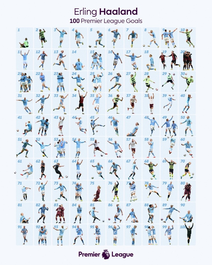 > 哪个画面你还铭刻?英超海报致意哈兰德,再现他100次进球片刻