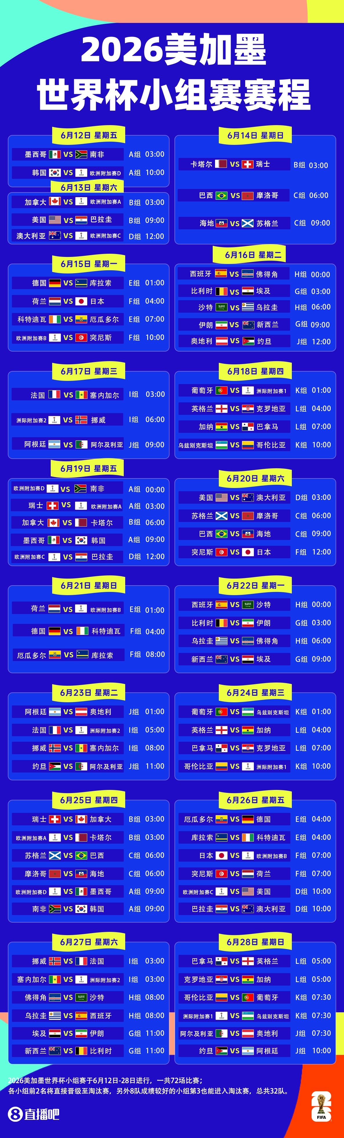 以下为小组赛每组具体赛程(官方赛程技术均为好意思东技术,照旧换算为北京技术)