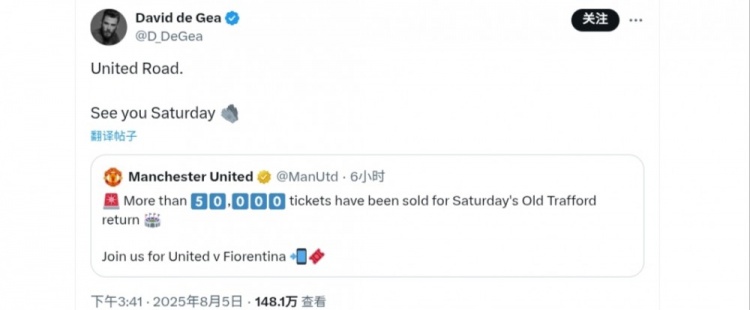 曼联社媒预热主场对阵佛罗伦萨,德赫亚转发:咱们周六见