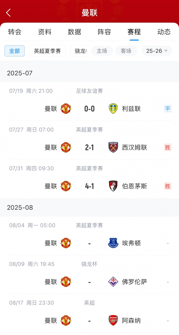 曼联8月还有两场季前热身赛,分裂对阵埃弗顿、佛罗伦萨。随后新赛季英超将打响,曼联首轮对阵阿森纳。