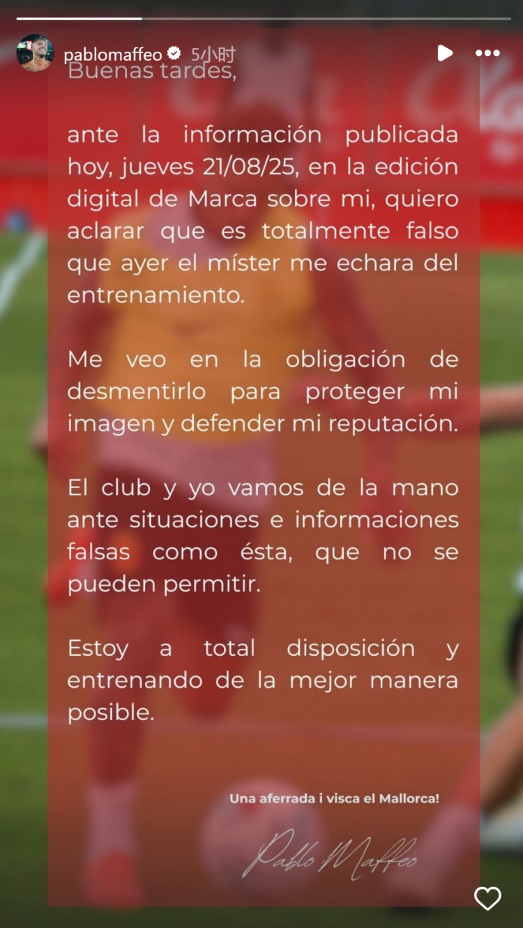 8月22日讯 马洛卡右后卫马菲奥更新社媒动态,否定我方被逐出磨砺的报谈。