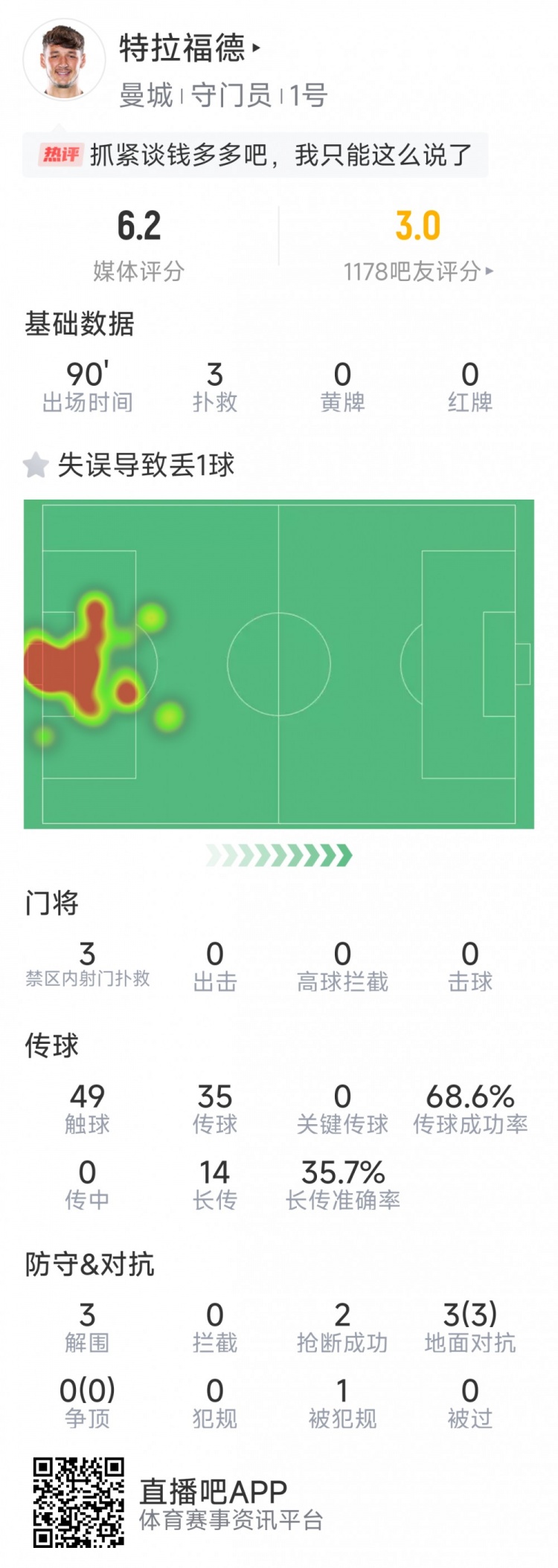 交膏火,特拉福德本场数据:3次扑救,乖谬导致失球,禁区外犯规