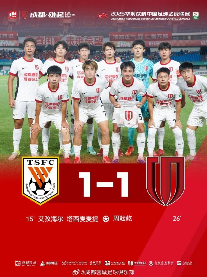 中乙联赛决赛阶段首轮,成齐蓉城B队1-1战平山东泰山B队