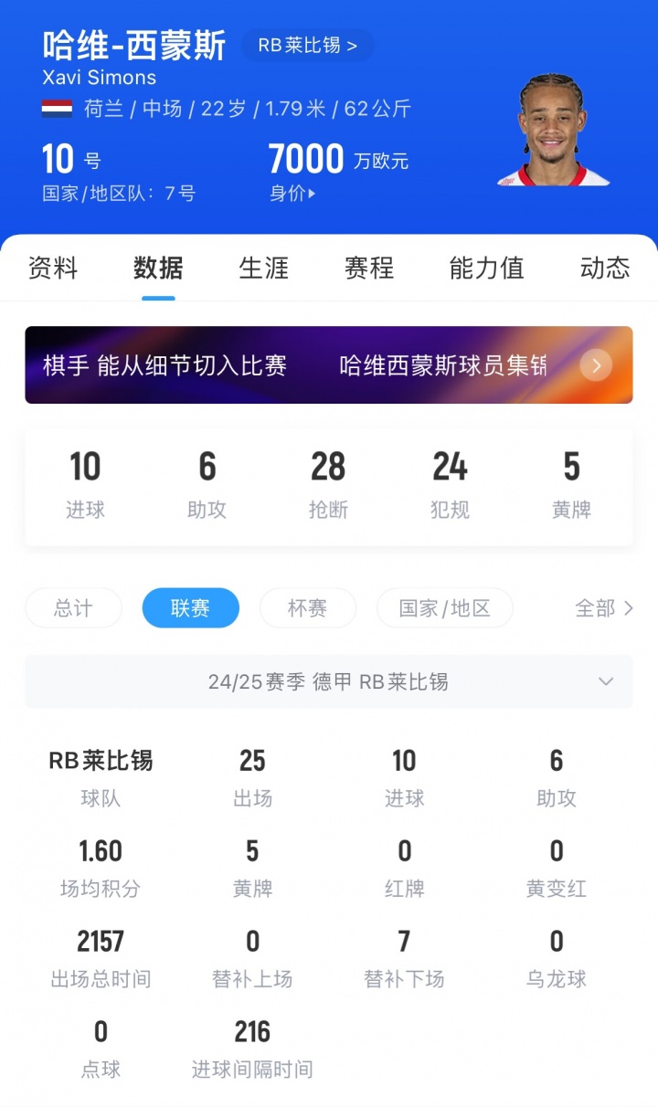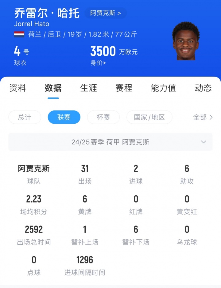 哈托现年19岁,身价3500万欧;西蒙斯现年22岁,身价7000万欧。两东谈主同为荷兰国脚。