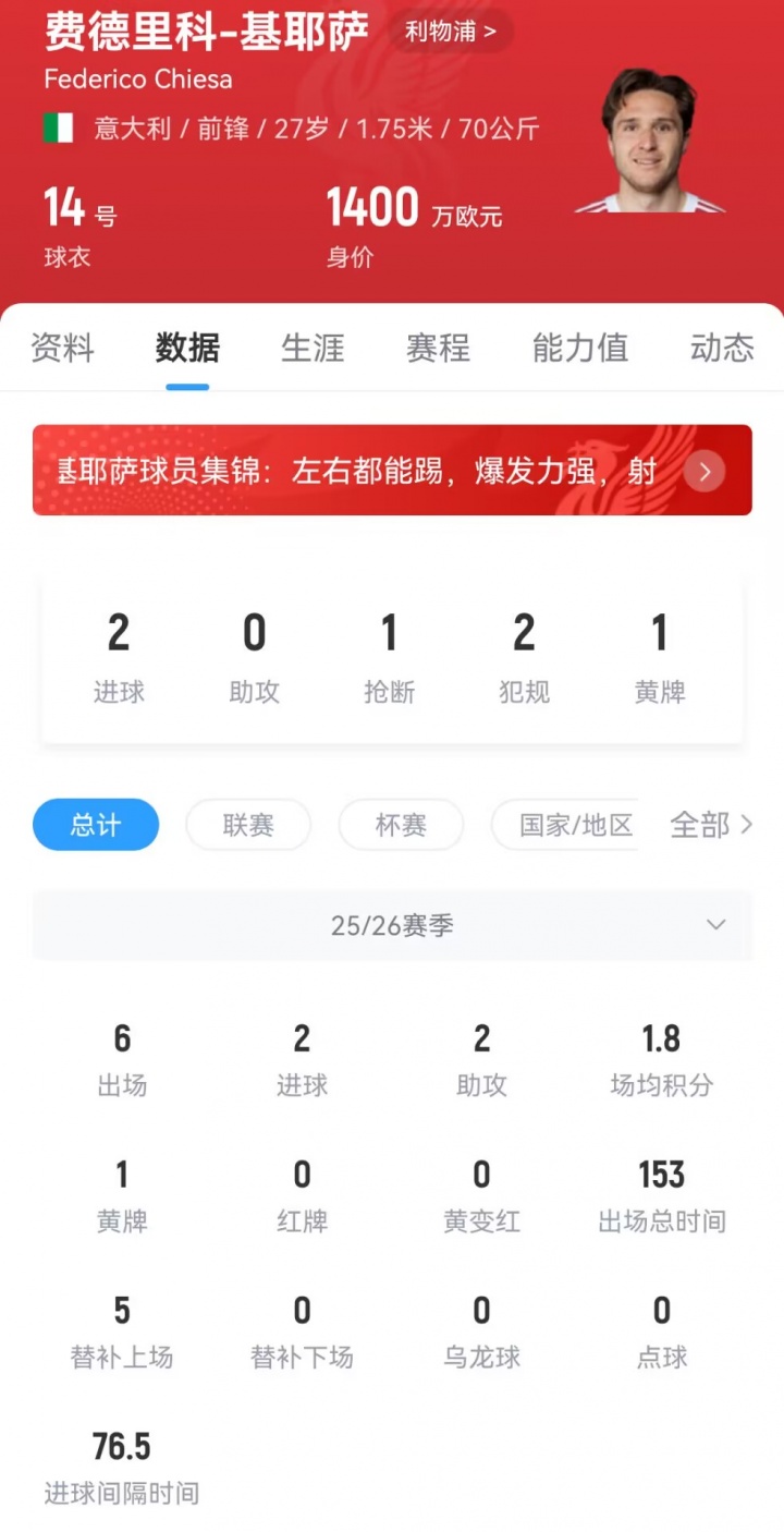 本赛季,基耶萨照旧为利物浦在各项赛事中出场6次,孝敬2球2助,现在的身价为1400万欧元。