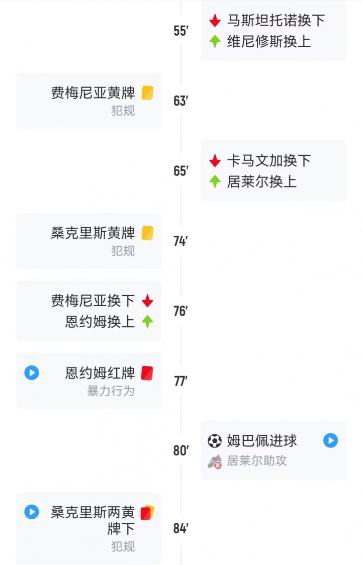 第77分钟,相似是替补登场的恩约姆刚上场1分钟,就因对维尼修斯犯规被主裁直红罚下。
