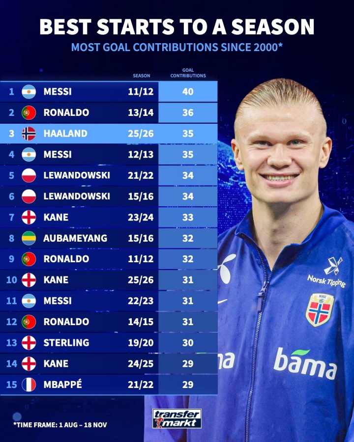 11月20日讯 德转统计了本世纪赛季开局的进球孝顺数,哈兰德以35粒进球位居历史第三,仅次于梅西和C罗。