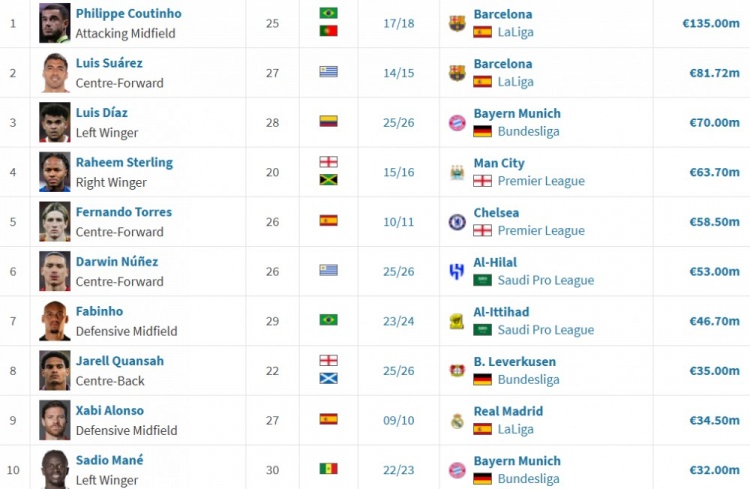 1.库蒂尼奥 25岁 17/18赛季 卖给巴萨 1.35亿欧