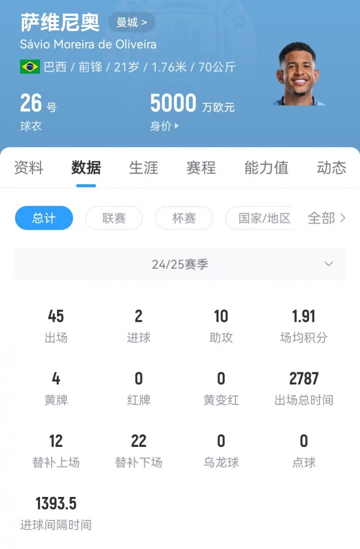 21岁的萨维尼奥上赛季为曼城出战45场,孝敬2球10助攻。球员现在的德回身价为5000万欧元。