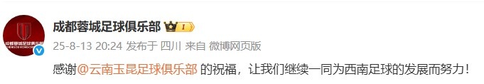 成齐蓉城官方转发并恢复:感谢云南玉昆足球俱乐部的道贺,让咱们无间一同为西南足球的发展而竭力于!