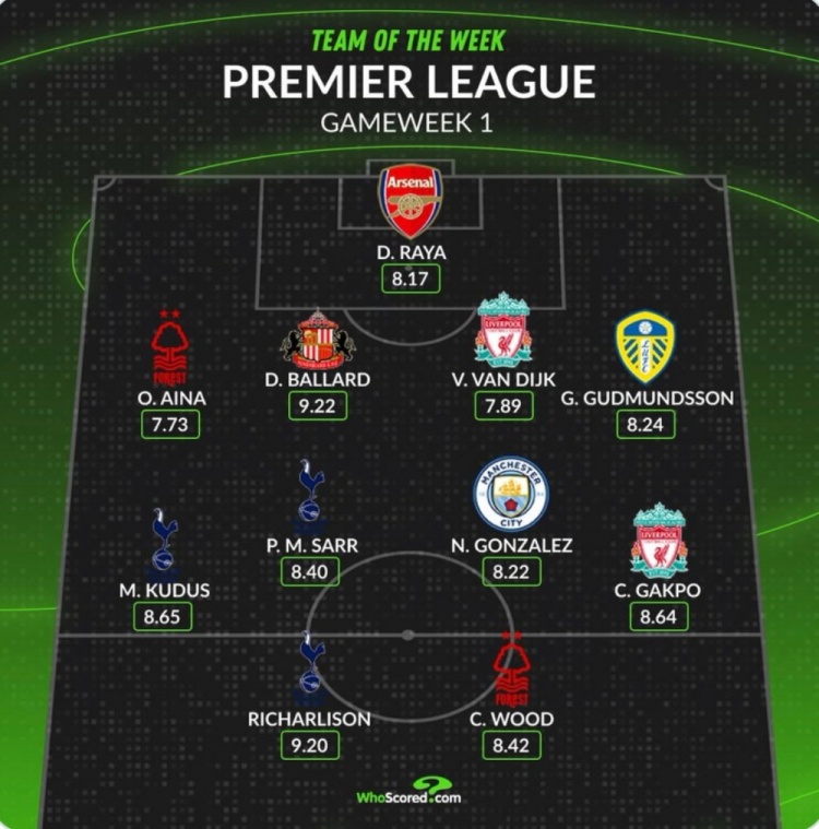 Whoscored评英超首轮最好阵:拉亚、加克波、理查利森在列