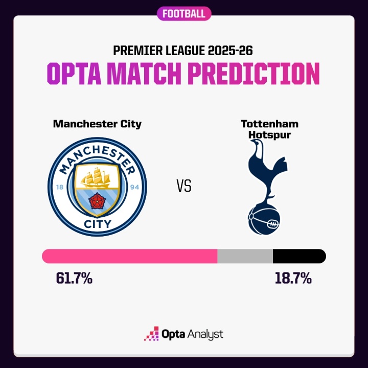 08月23日讯 今晚19:30,英超第2轮焦点战曼城vs热刺。曼城首轮4-0驯服狼队,而热刺3-0驯服伯恩利,此役瓜迪奥拉证据罗德里、福登不错出战,本轮谁能争得两连胜?Opta超等估量机展望,曼城的胜率为61.7%。