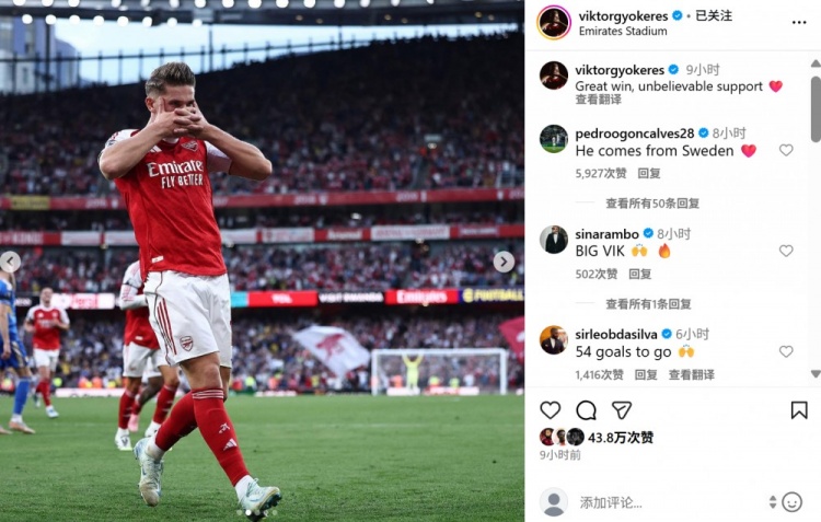 本场比赛阿森纳新援约克雷斯梅开二度,赛后他在个东说念主社媒晒出标记性庆祝算作,配文写说念:“漂亮的告成!球迷们的复古难以置信!”