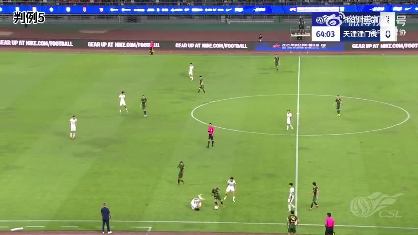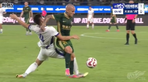 判例五:中超联赛第23轮(调赛),浙江俱乐部绿城VS天津津门虎。比赛第65分钟,浙江俱乐部20号队员手臂击打到天津津门虎4号队员头部,评判员未判罚犯规,VAR未介入。