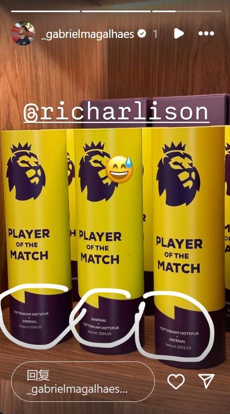赛后,理查利森在个东谈主社媒晒了他领取全场最好球员的像片,并瑰丽了阿森纳后卫加布里埃尔。随后,加布里埃尔更新社媒,晒出我方3次拿到英超北伦敦德比全场最好的奖杯给予抵抗,他也艾特了理查利森。