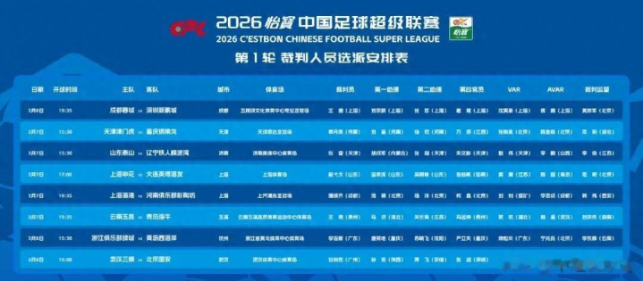 刚刚,中超联赛官方账号公布了2026赛季中超联赛第1轮裁判人员选派安排表。新赛季揭幕战成都蓉城坐镇主场迎战深圳新鹏城的比赛将由国际级裁判王迪担任主裁判,边裁分别为刘宗麒、张哲,VAR则是沈寅豪。