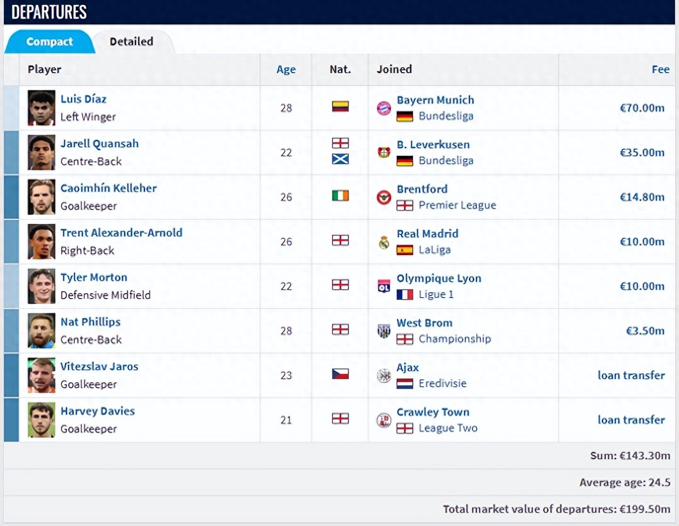 莫顿以1000万欧加500万欧浮动的转会费加盟里昂,利物浦还有球员20%二转分红。加上迪亚斯、宽萨等东说念主,利物浦今夏出售球员收入已达1.433亿欧。此外,努涅斯、基耶萨、埃利奥非凡东说念主也可能今夏离队。