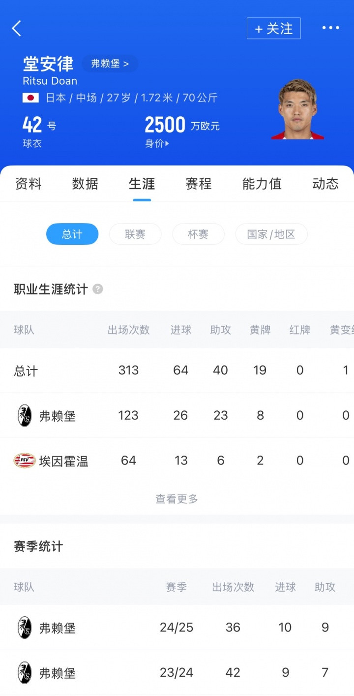 堂安律现年27岁,日本国脚。弗莱堡在2022年破耗850万欧元从埃因霍温签下堂安律,遵守弗莱堡于今,球员出场123次,孝敬26球23助,当今堂安律德回身价为2500万欧元。