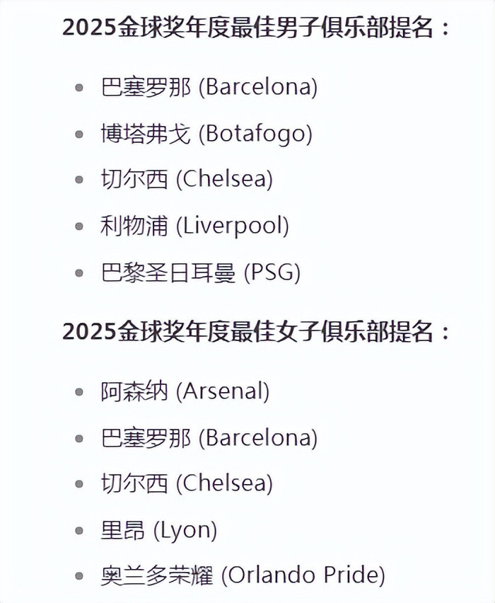 2025金球奖俱乐部提名揭晓, 切尔西冲击双冠王荣誉