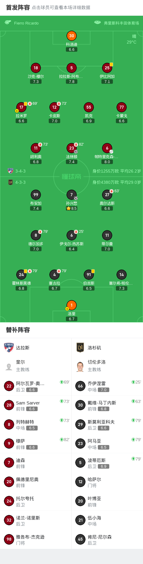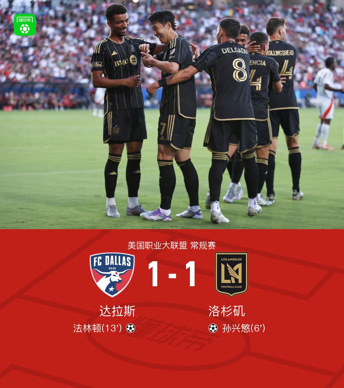 达拉斯1-1洛杉矶,孙兴慜首开纪录,法林顿扳平比分