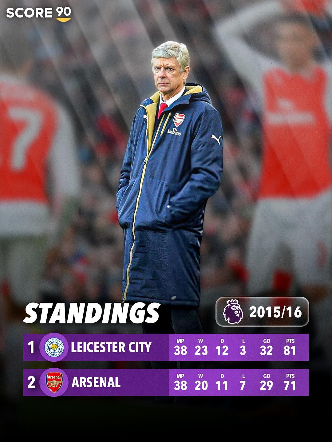 在此时辰,阿森纳一共有五次得回英超亚军,除了连年来的三连亚,还履历了15/16赛季的莱斯特城古迹。
