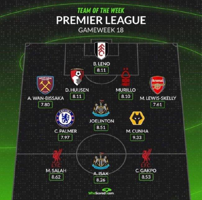英超第18轮一齐限制,数据网站Whoscored也清点了本轮比赛最好声势,其中萨拉赫、帕尔默在列,以下为具体情况: