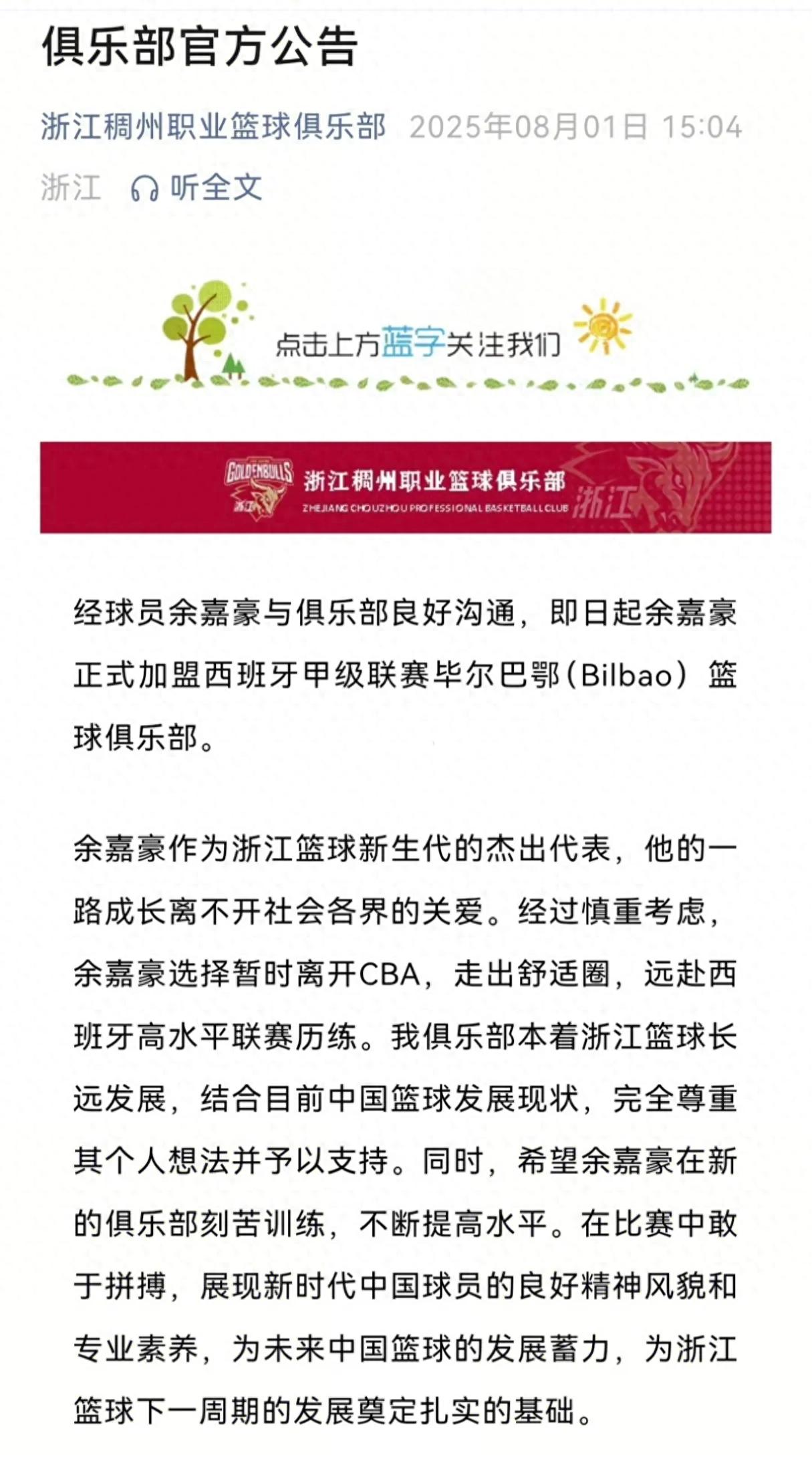 浙江稠州俱乐部官方发布公告,A类条约到期的球员余嘉豪,即日起崇拜加盟西班牙甲级联赛的毕尔巴鄂队。