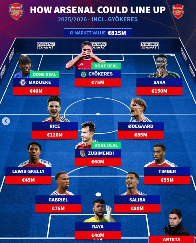德转瞻望阿森纳主力阵:马杜埃凯、约克雷斯、祖比门迪在列