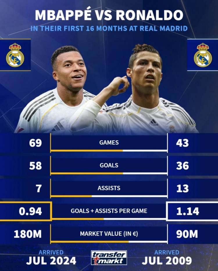 效用皇马前16个月数据:姆巴佩69场58球7助,C罗43场36球13助