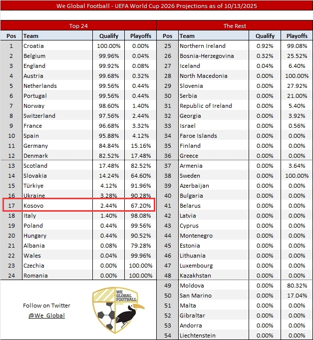 据We Global Football臆想,科索沃小组第一纵贯宇宙杯的概率仅2.44%,但干与欧洲区附加赛的概率高达67.2%。