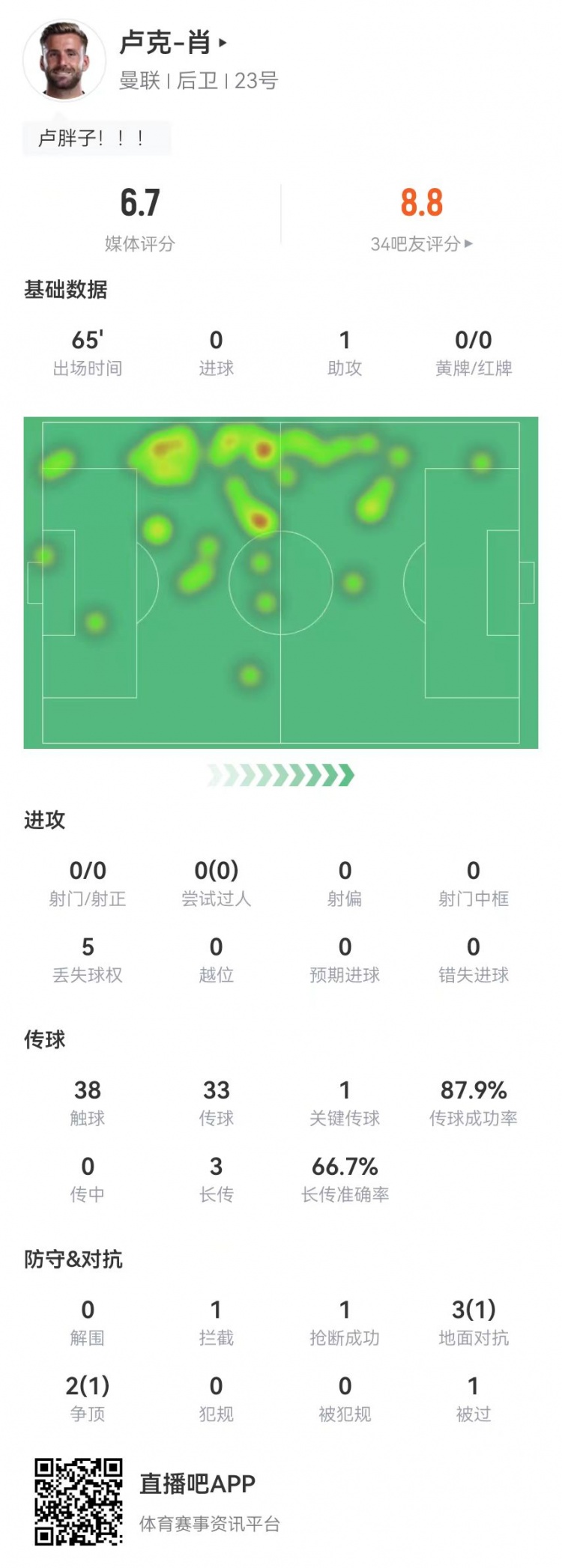 卢克-肖本场1助攻+1关键传球 5抗拒2告捷+3长传2告捷 获评6.7分
