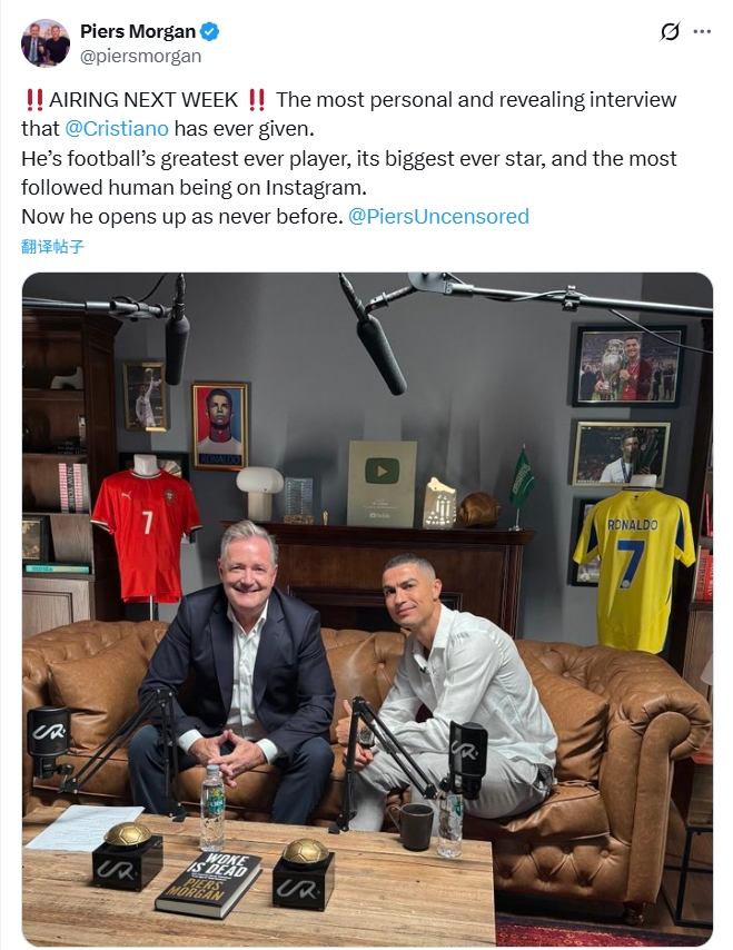 11月01日讯 此前盛名主抓东谈主皮尔斯-摩根在社媒预报,我方下周将发布与葡萄牙巨星C罗进行的专访节目。当天摩根再度发布社媒预热此次专访。