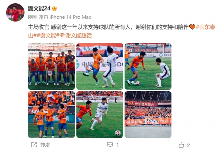 中超第29轮,泰山队主场2-1驯服津门虎,这亦然泰山队赛季主场收官战。赛后,谢文能更新社媒系念,他写谈:主场收官 感谢这一年以来因循球队的通盘东谈主,谢谢你们的因循和奉陪。