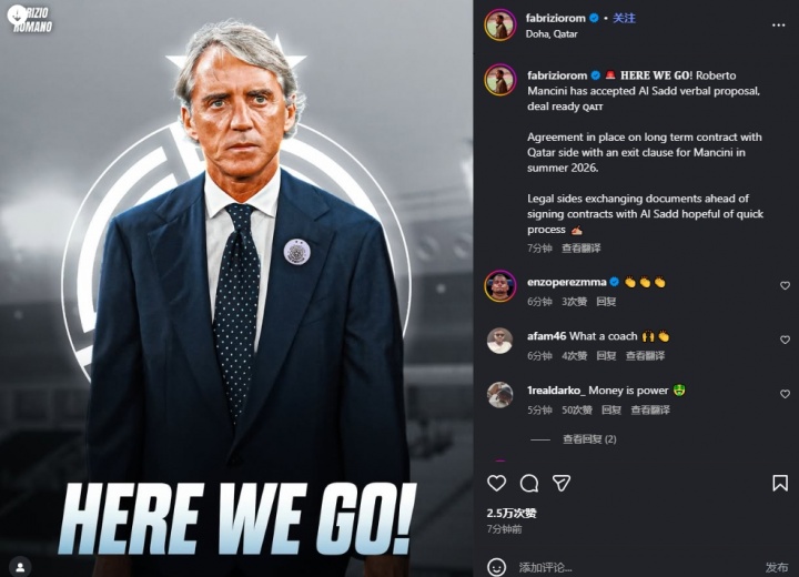 11月11日讯 名记罗马诺用象征性和“here we go!”证实,意大利籍主老练曼奇尼将捏教卡塔尔俱乐部阿尔萨德。