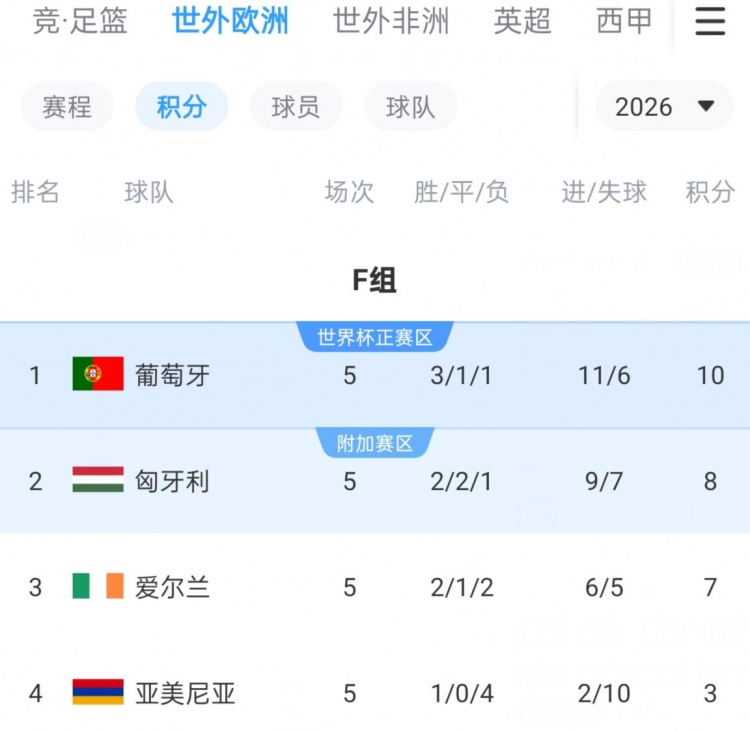 世初赛欧洲区小组赛F组现在的积分所在如下: