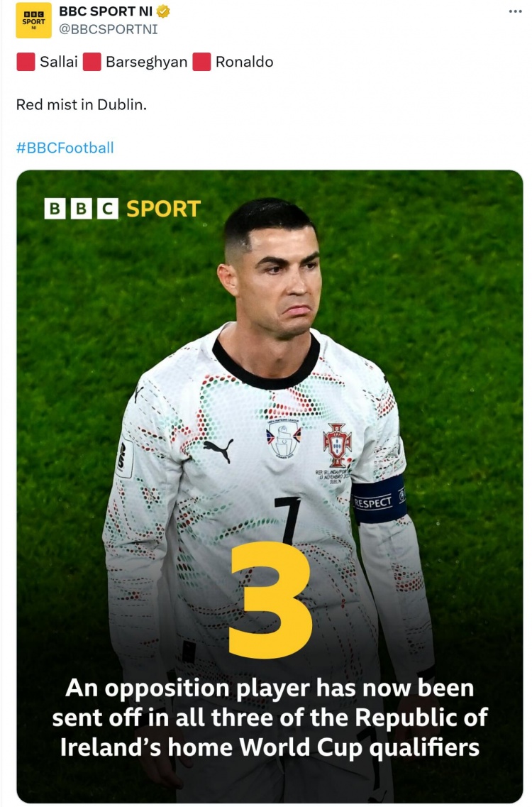 爱尔兰本届世初赛三个主场齐有对方球员拿红牌,C罗是其中第三东说念主