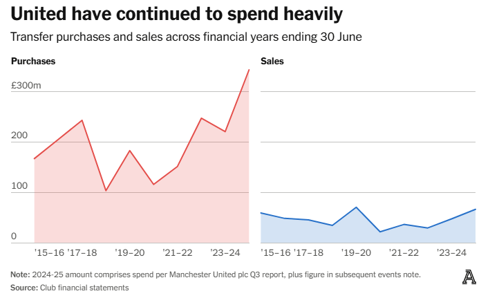 加上戒指3月31日的九个月内破钞的2.721亿英镑,曼联上赛季的球员注册资本达到了惊东谈主的3.435亿英镑——这是英格兰足球历史上第三高的单赛季记录(尽管利物浦可能很快就会将其挤到第四位)。