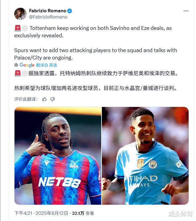 列维: 猜下还会买几个? 热刺与曼城萨维尼奥和水晶宫埃泽伸开筹商!