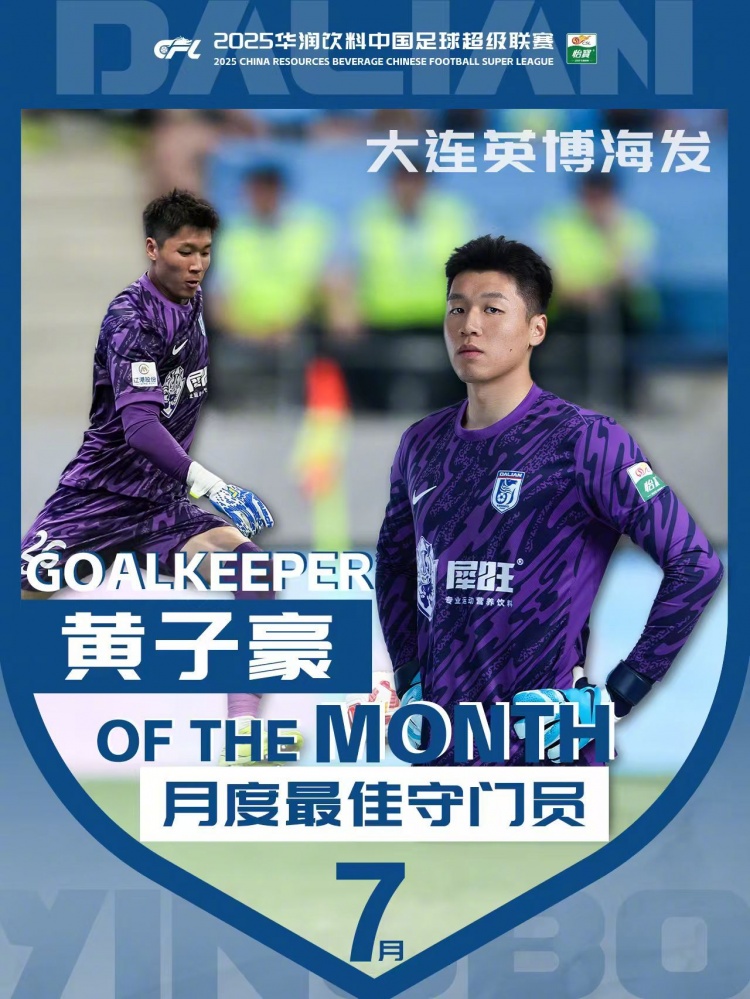 8月14日讯 中超联赛官方公布了7月最好守门员东谈主选,大连英博俱乐部门将黄子豪当选,两场比赛中黄子豪坐镇的球门从未被攻破,扑救奏服从100%。