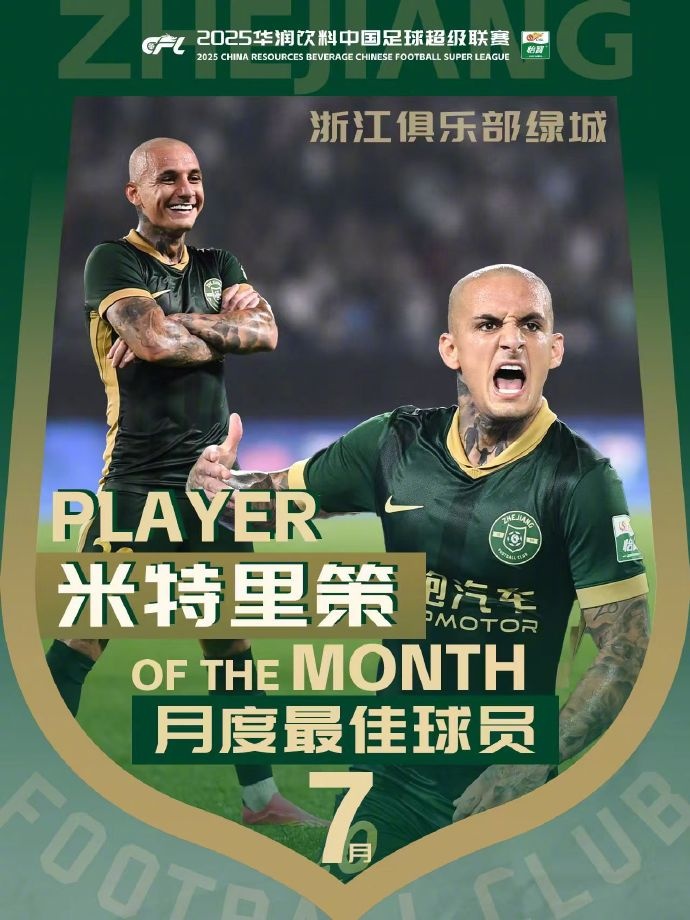 8月14日讯 中超官方音信,浙江队外助米特里策当选7月最好球员。