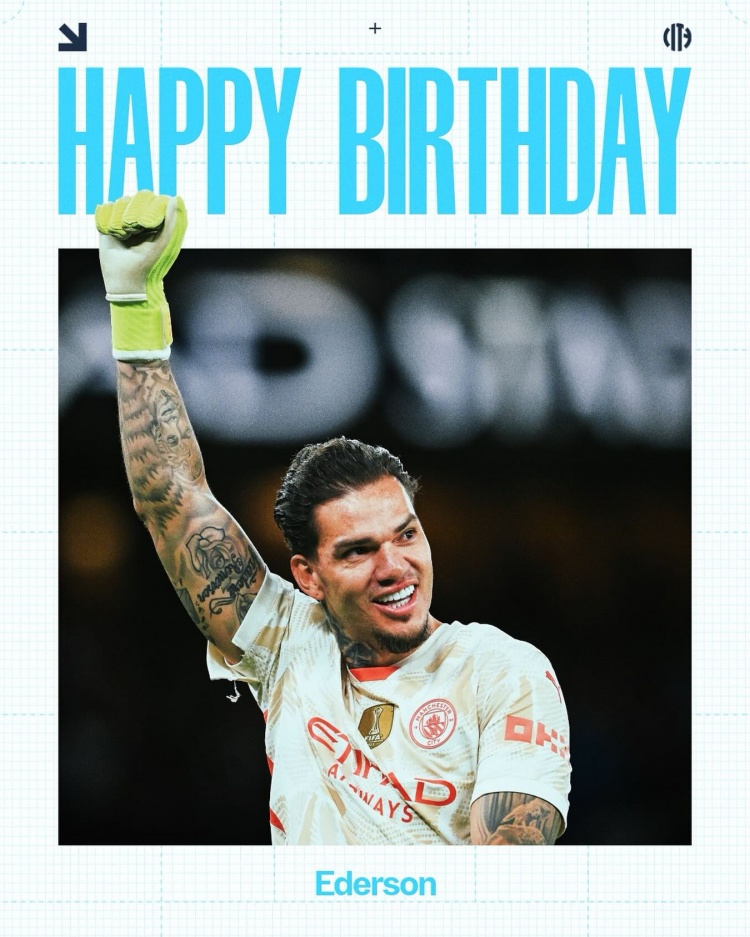 曼城官方社媒晒出埃德森的诞辰海报,配文:“祝你诞辰欢欣,埃德森!”