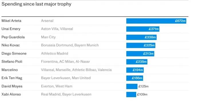 电讯报统计了上一次夺冠之后,各大主帅在引援上的累计消耗,阿尔特塔消耗6.72亿英镑断层最初。