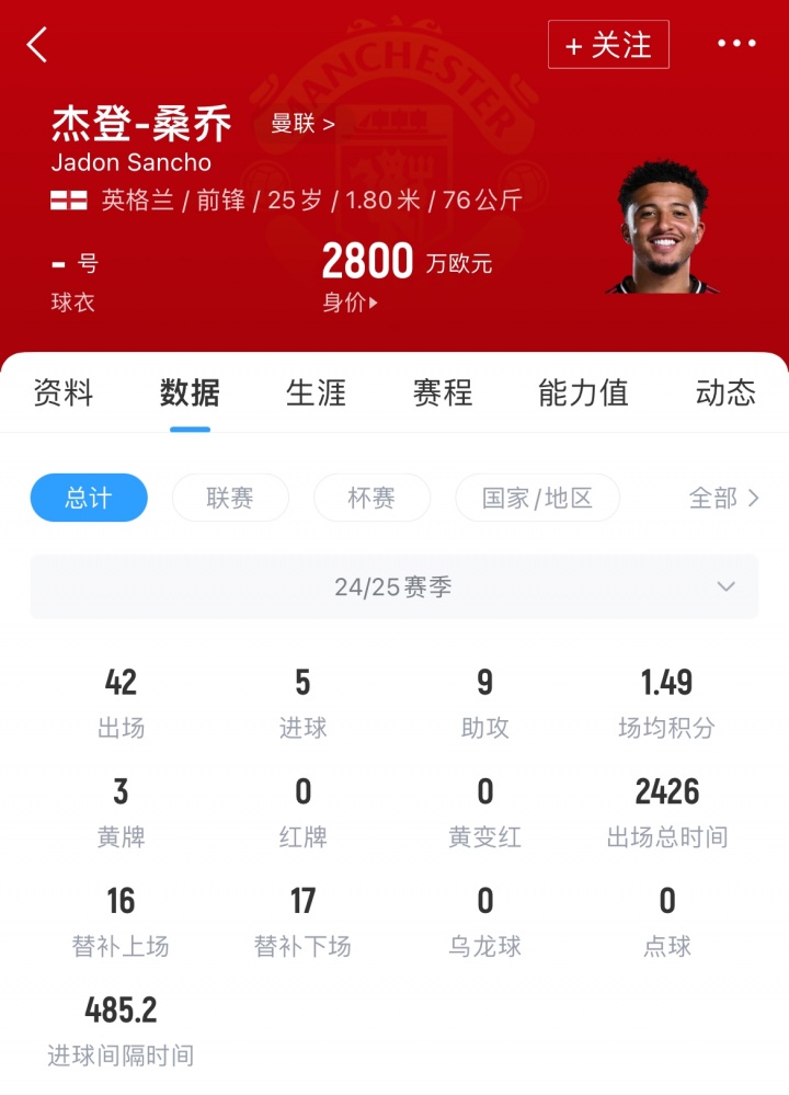 桑乔上赛季被租赁至切尔西,为切尔西出场42场,赢得5粒进球和9次助攻,现在其德回身价为2800万欧。