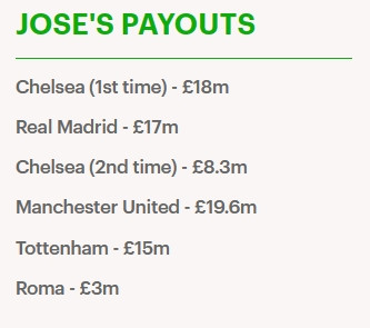 加上此前被切尔西、皇马、曼联、热刺和罗马罢职的解约金,穆帅生存所获解约金已累计约莫9400万镑,接近1亿镑。不外,之前有媒体报说念过,穆帅曾毁灭其中一部分的解约金。