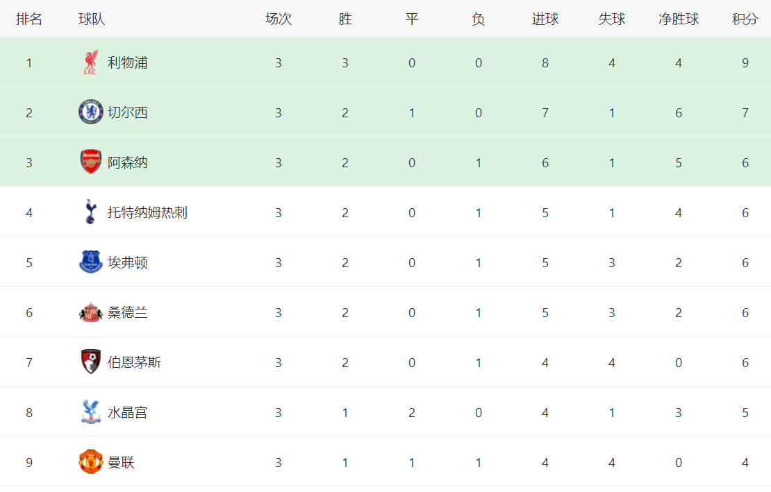 在积分榜上,利物浦3战全胜,拿到9分,排行榜首。英超只剩利物浦这一队保持全胜。切尔西的战绩是2胜1平,拿到7分,排行第2。阿森纳、热刺、埃弗顿、桑德兰、伯恩茅斯王人是6分。曼联的战绩是1胜1平1负,只拿到4分,排行第9。曼城的战绩就差了,3场比赛1胜2负,只拿到3分,排行掉到第13。这么的排行关于曼城这种顶级朱门来说太羞耻了!