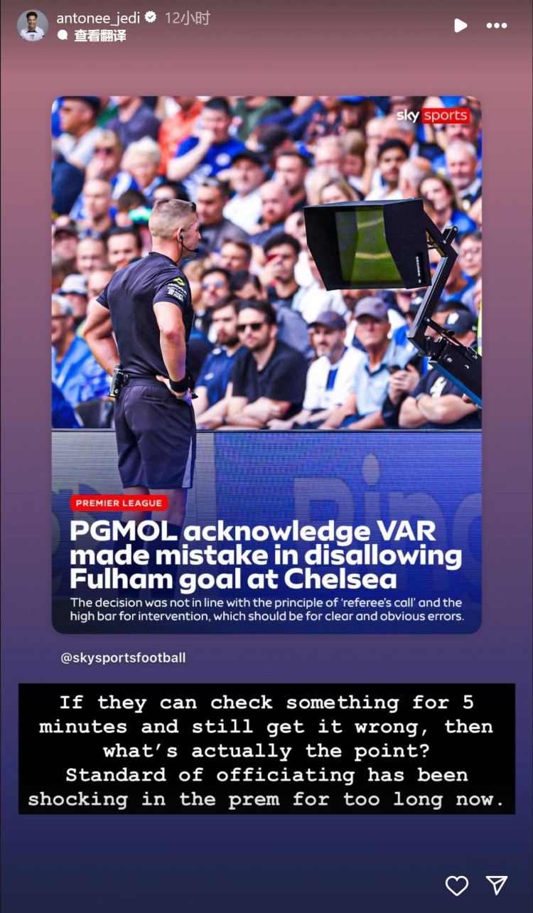 罗宾逊写说念:“要是他们花5分钟检讨一件事,恶果也曾出错了,那确立VAR到底还有什么酷好酷好呢?万古辰以来英超裁判的法律阐述水平太恶运了。”