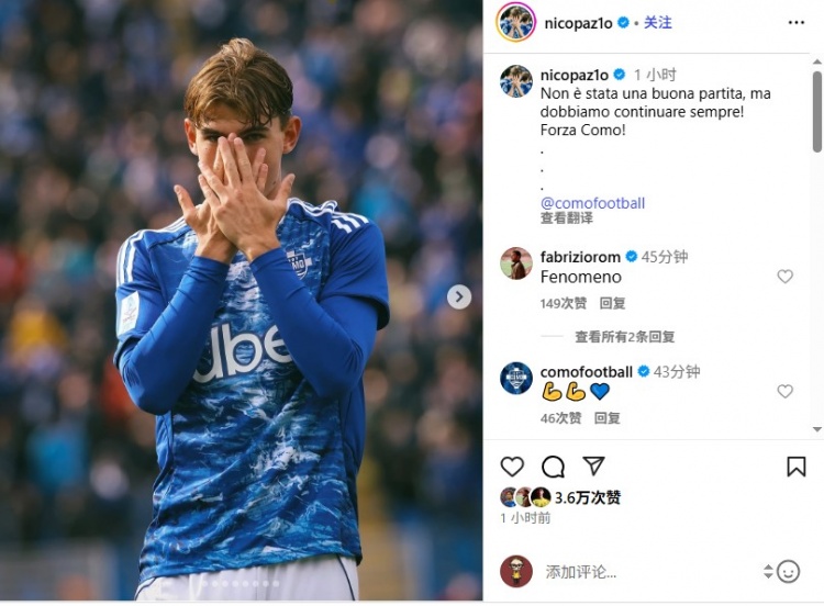 科莫本轮1-1战平克雷莫内塞,帕斯写说念:“这不是一场精彩的比赛,但咱们必须长期链接前进!加油科莫!”